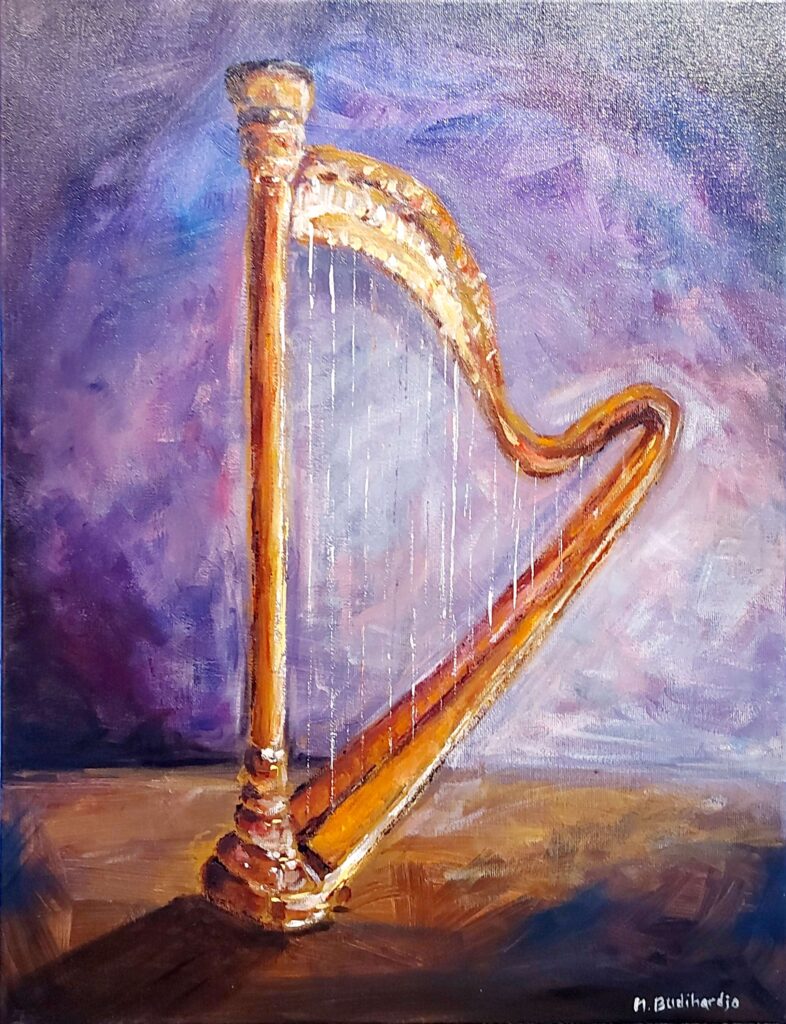 A Joyful Noise celebrates the spirit of Psalm 100: “Make a joyful noise to the Lord.” The painting depicts a harp, bathed in warm, radiant light, its strings resonating with the unseen music of praise. Vibrant colors and flowing textures convey movement, rhythm, and the exuberance of worship. Delicate highlights suggest the divine energy that inspires song, inviting viewers to feel the joy, devotion, and uplifting power of music as an offering to God. The composition embodies the beauty and timelessness of praising the Lord through song.