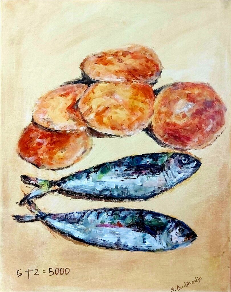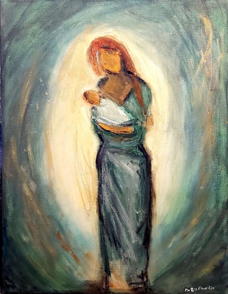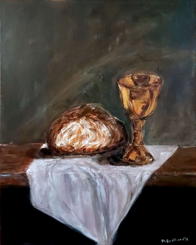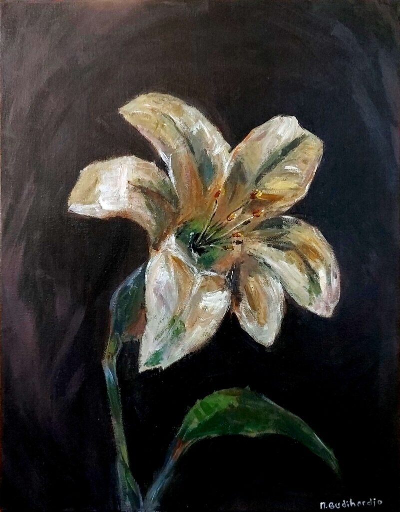 / This painting depicts a gracefully blooming white lily, a symbol of the beauty of God’s creation. In its simplicity, the flower reflects a Bible verse and the lyrics of a famous Indonesian Sunday School song from the artist childhood: “Lilies in the field are given beauty, but you are even more loved by God.” The simplicity of the flower reminds us that God adorns even the most ordinary things, and even more, He loves every human being deeply.