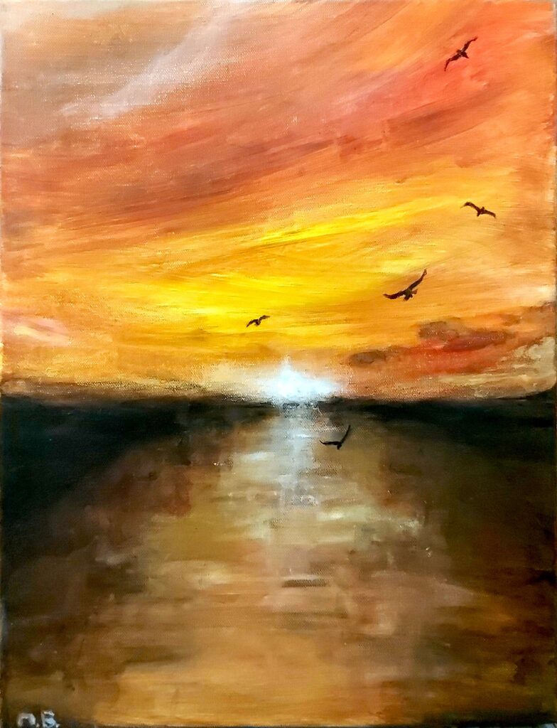 A warm morning scene where the sun has just begun to rise. Its bright light spreads gently across the scene while everything else remains dark. The contrast of warm sunrise against the surrounding darkness symbolizes a new day and the promise that Jesus makes everything new. In the brightening sky, the silhouettes of small birds glide across the light, reminding us that Jesus cares even for the smallest creatures. “Behold, I make all things new.” — Revelation 21:5. “Look at the birds of the air; they do not sow or reap or store away in barns, and yet your heavenly Father feeds them.” — Matthew 6:26