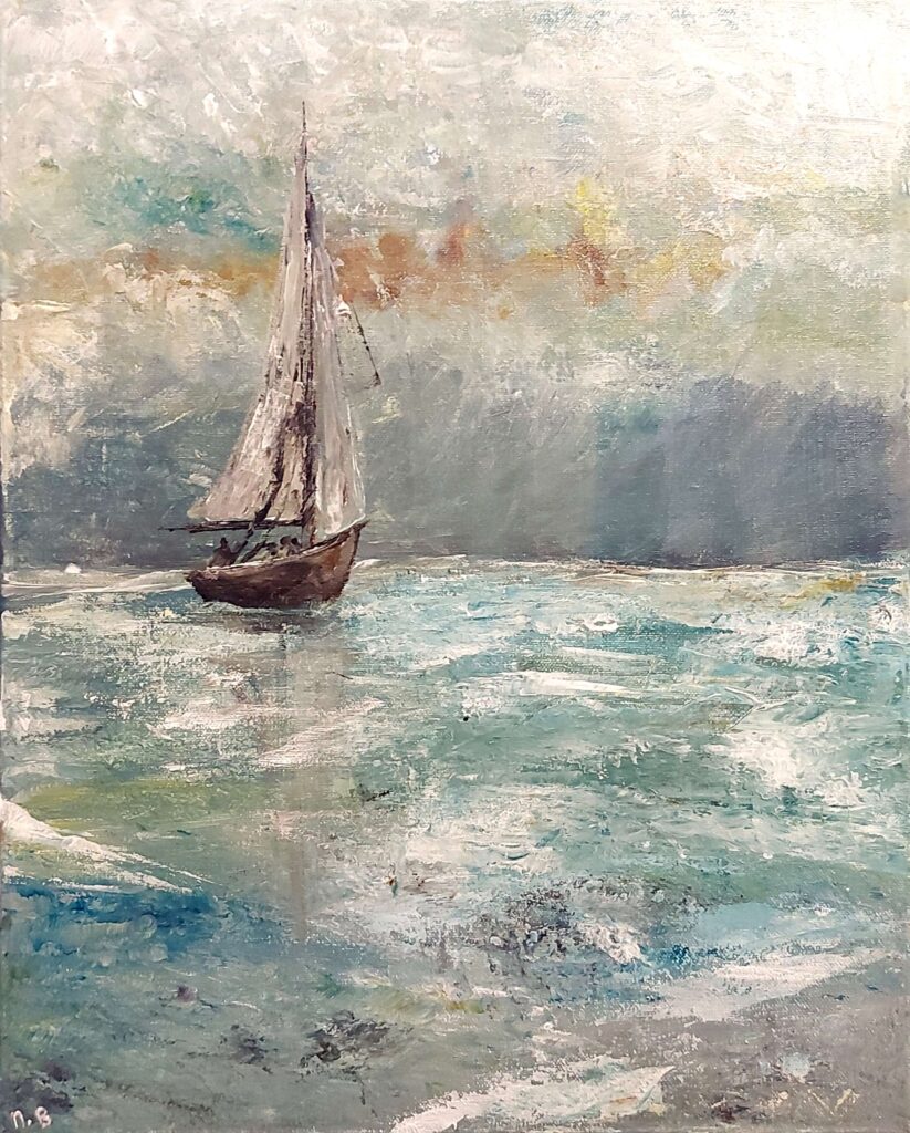 Ein halb-abstraktes Spachtelgemälde des Meeres, kurz nachdem sich der Sturm gelegt hat. Dicke, strukturierte Striche in tiefem Blau und Grau zeigen die letzten Kräuselungen der verebbenden Wellen. In der Mitte tritt ein kleines Boot in einfachen Formen hervor. „Er stand auf, bedrohte den Wind und sprach zu den Wellen: ‚Schweig! Sei still!‘ Da legte sich der Wind, und es trat völlige Stille ein.“ — Markus 4,39. Das gesamte Gemälde vermittelt jenen Moment, in dem Chaos in Stille übergeht, in dem Angst in Staunen übergeht und in dem die Autorität Jesu die Natur selbst verwandelt.