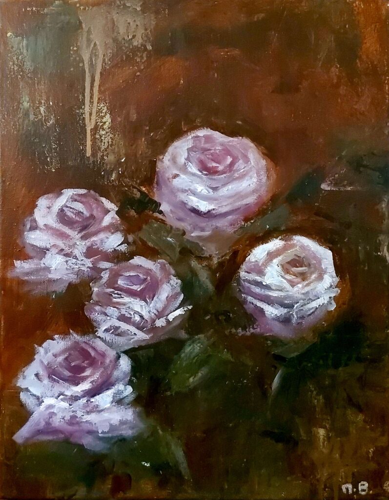 Eine halb-abstrakte Rose entfaltet sich in zarten Schichten aus sanftem Rosa, mildem Flieder und Hauch von Weiß, jede Blüte modelliert mit Spachteltexturen, die Leben und Bewegung in die Blume bringen. Die Rose wirkt wie ein verborgener Garten, ein Heiligtum der Schönheit, versteckt in einer einzigen Blüte. Um sie herum wirbelt der abstrakte Hintergrund in tiefen, gedämpften Tönen, die stille Ehrfurcht und sanftes Staunen hervorrufen und den Blick zum leuchtenden Herzen der Rose führen. „Wer unter dem Schirm des Höchsten sitzt, der bleibt im Schatten des Allmächtigen.“ — Psalm 91,1