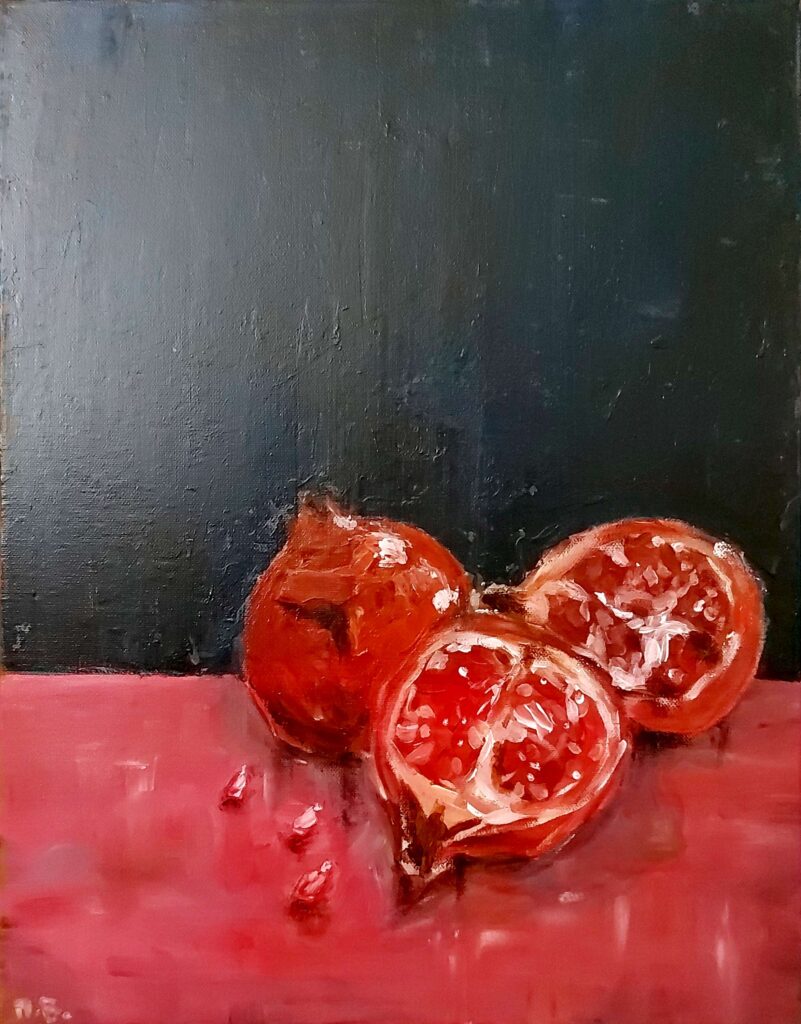 A still-life painting of pomegranates, their deep red skins glowing against a dark navy-blue background. The contrast makes the fruit appear rich, full, and vibrant. Light catches the opened pomegranate, revealing glistening ruby seeds that symbolize prosperity, blessing, and abundance. The dark background adds depth and elegance, highlighting the fruit’s vivid, life-filled color. Deuteronomy 8:8 – “A land with wheat and barley, vines and fig trees, pomegranates, olive oil and honey.” (The pomegranate represents the richness and fertility of God’s blessings.)