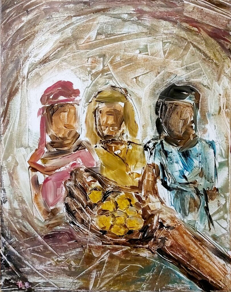 Ein kräftiges, ausdrucksstarkes Gemälde, das das Gleichnis von den anvertrauten Talenten darstellt, in nur 15 Minuten mit einer einzigen Farbschicht und einem Spachtel geschaffen. Die Figur des Gebers reicht die goldenen Talente in die Richtung von drei Männern, die jeweils unterschiedlich reagieren: einer voller Eifer, einer nachdenklich, einer zögerlich. Dicke, selbstbewusste Striche und eine reduzierte Farbpalette vermitteln Bewegung, Emotion und die Bedeutung des Moments, ohne ins Detail zu gehen. Die Einfachheit der einlagigen Spachteltechnik betont Unmittelbarkeit und rohe Energie, während die leuchtenden Talente und die kontrastreichen Schatten den göttlichen Segen und die Verantwortung hervorheben, die jedem Mann anvertraut sind. Trotz der schnellen Ausführung fängt das Gemälde das Wesen von Gelegenheit, Verantwortung und der menschlichen Reaktion auf Gottes Gaben ein. Inspiriert vom Gleichnis von den Talenten (Matthäus 25,14–30).