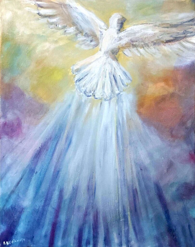 Under Your Wings depicts a luminous white dove symbolizing the Holy Spirit, descending gently against a background of radiant light. Inspired by the song “Holy Spirit, reveal to us the heart of the Father. Come, lead us closer to His heart” by Stefan Schöpfle & Mia Friesen, the painting conveys the deep sense of protection and comfort that God’s Spirit provides. Soft brushstrokes and glowing highlights evoke movement, warmth, and divine energy, inviting viewers to experience peace, inspiration, and the tender, reassuring presence of the Holy Spirit beneath His wings.